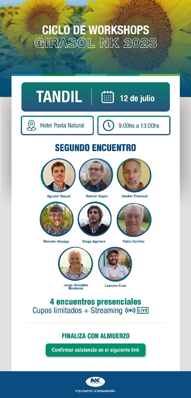 La presentación del porfolio ya tuvo lugar durante el 1° Workshop de Girasol, realizado en junio en Necochea. El miércoles 12 de julio, de 9 a 13 horas, se realizará el 2° Workshop de Girasol en la ciudad de Tandil y será otra oportunidad para que los productores, técnicos y especialistas de la zona conozcan las características de los nuevos híbridos tanto en el segmento tradicional, como alto oleico. “Con el crecimiento del NK 3969 CL, en su segmento linoleico, la marca consolida su liderazgo ofreciendo un híbrido adaptado a todas las regiones girasoleras del país. Asimismo, el equipo técnico se prepara dar los primeros detalles para el lanzamiento del nuevo híbrido alto oleico, que estará disponible a partir de esta campaña significando un hito en el segmento: el nuevo NK 3979 CLHO. NK ahora ofrece dos híbridos absolutamente líderes en el mercado en ambos segmentos”, asegura Gabriel Santachiara, Gerente de Desarrollo de Producto Maíz y Girasol en NK.