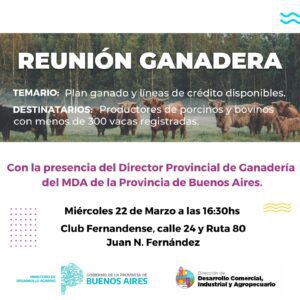 El próximo miércoles 22, desde las 16.30, se realizará en la localidad de Juan N. Fernández una reunión ganadera dirigida a productores de porcinos y bovinos con menos de 300 animales registrados, en la que se presentarán los beneficios del Plan Ganado Bonaerense 6×6 y las líneas de crédito disponibles para la actividad.