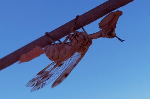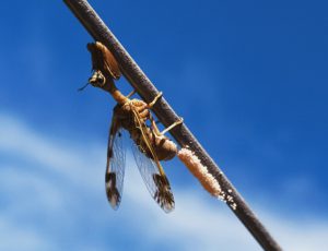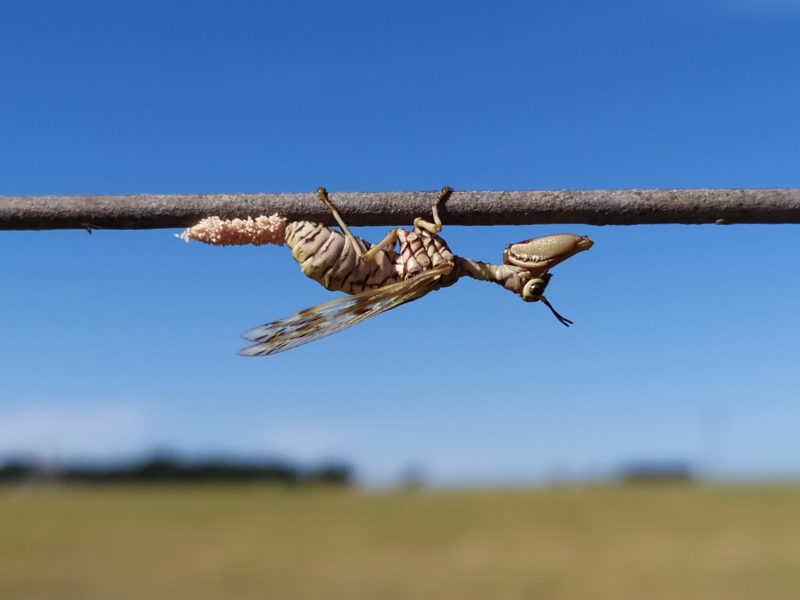 Un insecto despertó la curiosidad de vecinos de la ruta provincial 75, en cercanías a Gonzalez Chaves. “Pregunté que especie sería y nadie supo responderme”, manifestó un hombre que logró fotografiar la extraña especie que camina por un alambrado y parece ir dejando huevas.