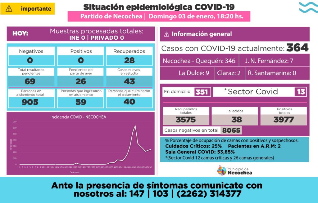 El parte de la secretaria de Salud indica que son 364 los casos activos de Covid-19 en el distrito de Necochea, 28 menos en relación a la jornada de ayer. Los pacientes recuperados en las últimas horas ascienden a 28 y son 905 las personas que cumplen el aislamiento total.