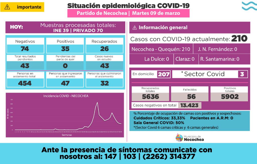 26 pacientes recibieron el alta por lo que hay 210 casos activos que corresponden todos a Necochea y Quequén.
