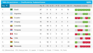 Los comandados por Lionel Scaloni aguardan todavía la resolución del encuentro ante Brasil de la sexta fecha que fue suspendido, pero de todos modos se ubican en la segunda posición de la tabla con 19 unidades, ocho menos que la Verdeamarela que lidera el torneo, pero seis más del puesto de repechaje.