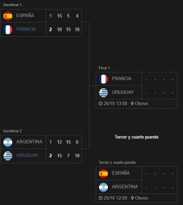 Curiosamente, quienes habían liderado ambos grupos, España (perdió ante Francia hoy por 2-1 con parciales de 15/10, 5/15 y 10/4) el A y Argentina el B siendo invictos los dos, se quedaron fuera de la gran final y ahora deberán pelear por el 3er y 4to puesto mañana en el mismo escenario.