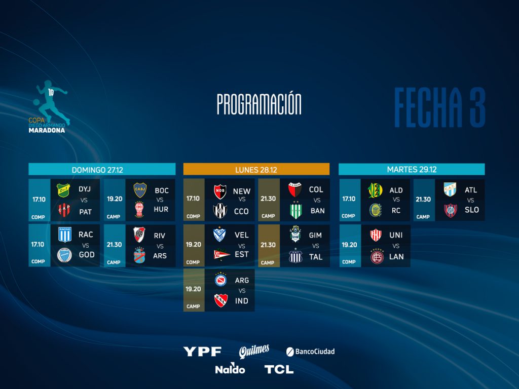 en tanto el capitulo 3 de la Copa Maradona seguirá mañana lunes y pasado martes con los siguientes encuentros: