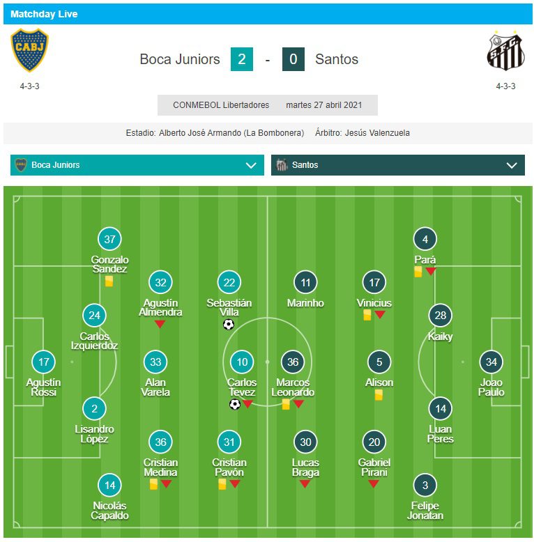 Santos no salió a esperar. Presionó alto y buscó progresar con pelota al piso, aunque Boca consiguió cortarle los circuitos y sólo consiguió ser más incisivo por las bandas, con Braga y Marinho. Al Xeneize, en principio, también le costó la elaboración, a partir de un mediocampo de buen pie, pero poco predispuesto a los rompimientos de líneas. Así, lastimó más con balones largos para sus velocistas: el regresado Pavón y Villa. Un remate del colombiano y otro de Tevez, lo más peligroso del dueño de casa en la primera media hora.