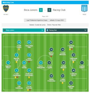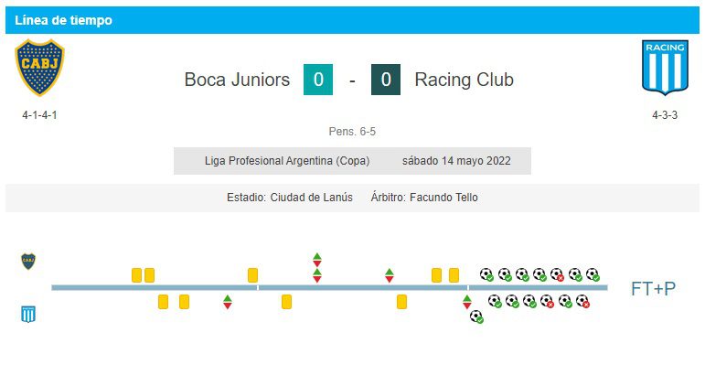Con el 0-0 en el marcador, el ganador se definió en los penales. Allí el ganador por 6-5 fue el Xeneize, en el que solo falló Eduardo Salvio, cuyo disparo fue atajado por el Chila Gómez. Por el lado de la Academia, Enzo Copetti no pudo con Agustín Rossi y Emiliano Insua la tiró afuera. Alan Varela convirtió el definitorio.