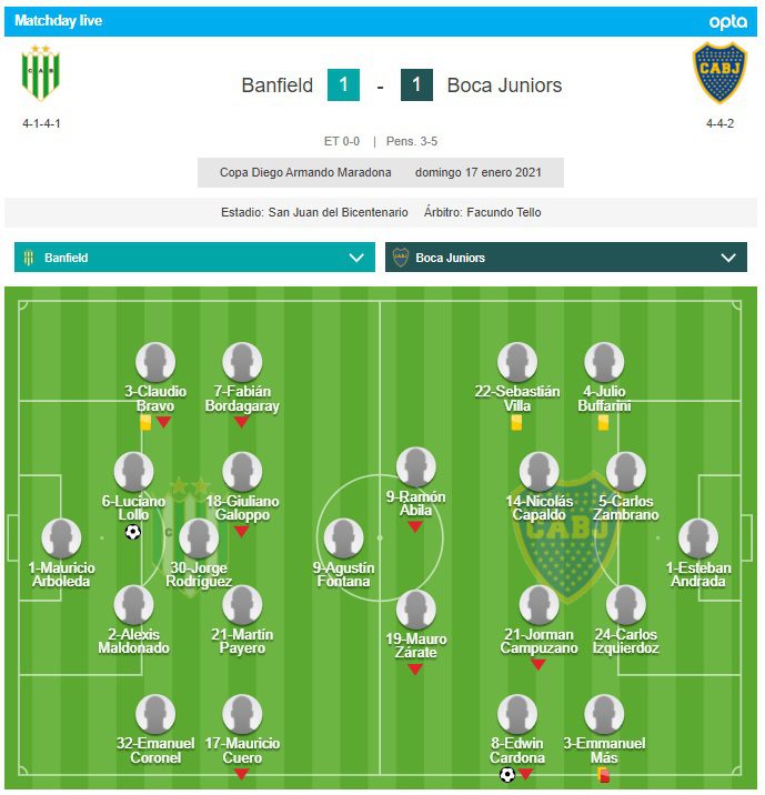 Boca volvió a gritar campeón en el estadio del Bicentenario de San Juan. El ganador de la última Superliga se impuso por penales ante Banfield tras empatar 1-1 en los 90 minutos y alzó la Copa Diego Maradona; un trofeo más para la nutrida vitrina de la Ribera, que además le sirve para atenuar el dolor por la derrota por 3-0 ante Santos que le impidió llegar a la definición de la Copa Libertadores.
