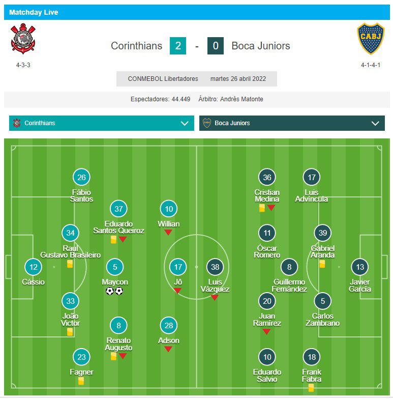 El cotejo se diluía entre la falta de imaginación del visitante y la resistencia cómoda del Timao, hasta que a los 33 minutos Boca quedó mal parado en un contragolpe, en el que Corinthians aceleró en superioridad numérica. Willian estiró para Roger Guedes, quien envió el centro y Maycon, una vez más, apuntó el 2-0.