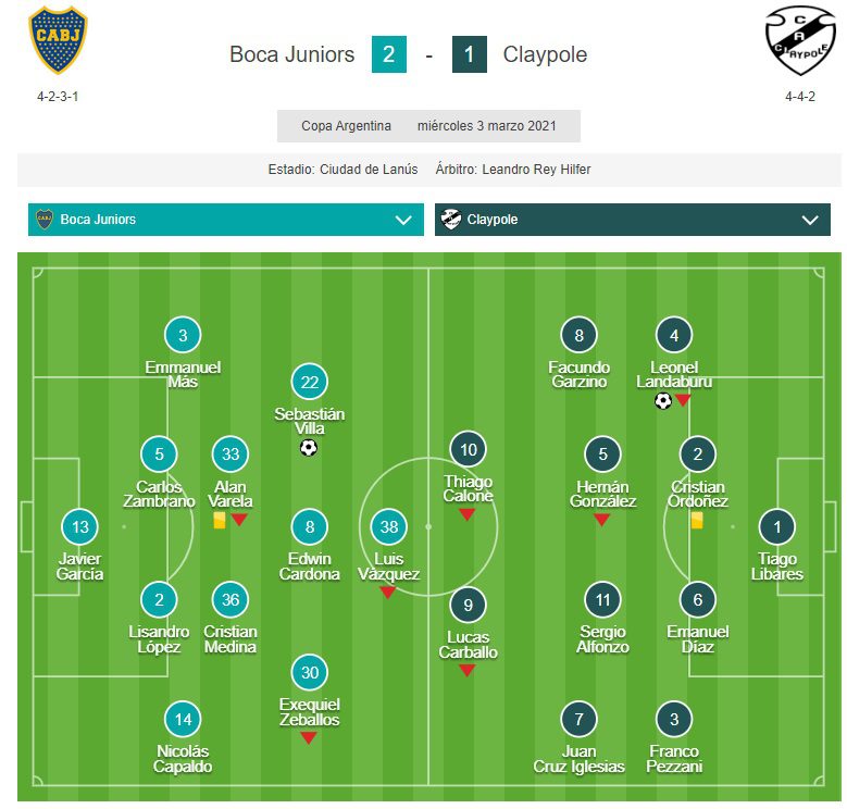 Boca: Javier García; Nicolás Capaldo, Lisandro López, Carlos Zambrano, Emmanuel Más; Exequiel Zeballos, Alan Varela, Cristian Medina, Edwin Cardona; Sebastián Villa y Luis Vázquez. DT: Miguel Russo.