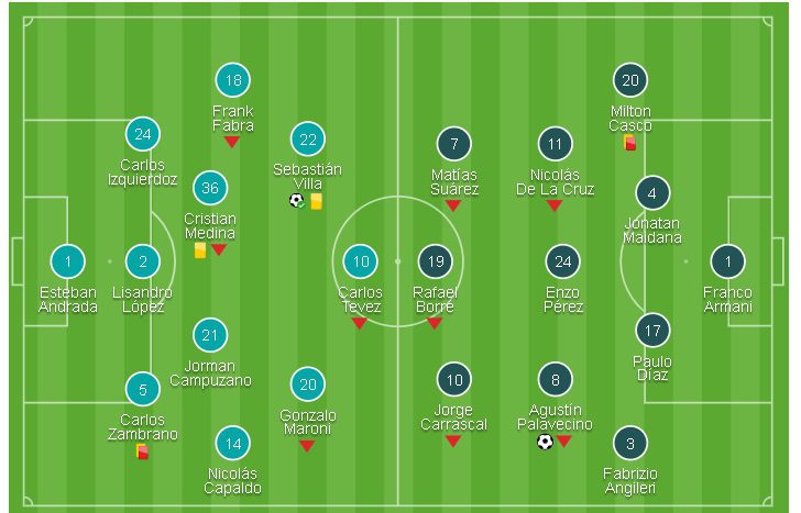 Era el mejor momento del equipo de Miguel Ángel Russo y pronto lo iba a reflejar en el marcador. Sobre los 39′, en una desinteligencia del fondo de River, Tevez habilitó a Nicolás Capaldo y Paulo Díaz lo bajó en el área. El árbitroTello sancionó el penal y Sebastián Villa dispuso el 1-0 con un certero remate por lo bajo.