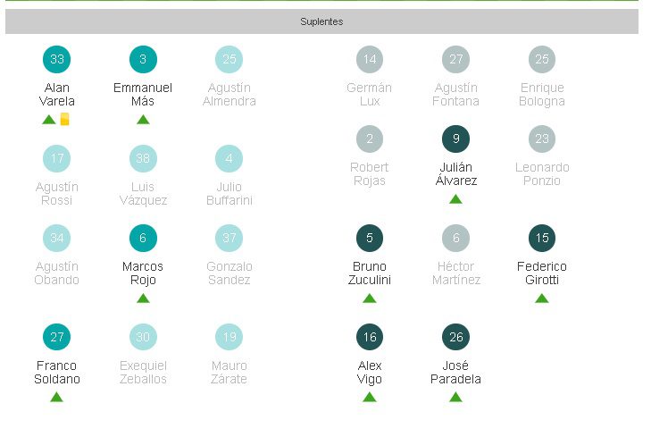 Fabrizio Angileri vuelve al once titular, tras perderse el partido con Argentinos Juniors por un problema familiar. De este modo, Milton Casco regresa a la banda derecha y Alex Vigo ocupa un lugar entre los suplentes. Vale recordar que Gonzalo Montiel quedó fuera de la nómina de convocados, debido a que tuvo mononucleosis hasta hace pocos días.