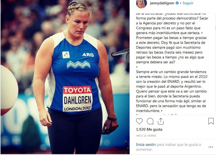 La lanzadora de martillo Jennifer Dahlgren, en primera instancia optó por analizar y “esperar por un cambio positivo” aunque luego se explayó en un comunicado más amplio donde habló se realizó varios planteos “¿Pero por qué el DNU? ¿Para agilizar (evitar) los tiempos de la burocracia? ¿Acaso esa burocracia no forma parte del proceso democrático? Sacar a la Agencia por decreto y no por el Congreso para mí es un paso falso que genera más incertidumbre que certeza.”