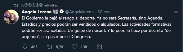 La joven atleta Brenda Palma, campeona argentina y duela de 12 records nacionales optó por la opción del retuit para mostrar su oposición al Decreto citando a la periodista Ángela Lerena