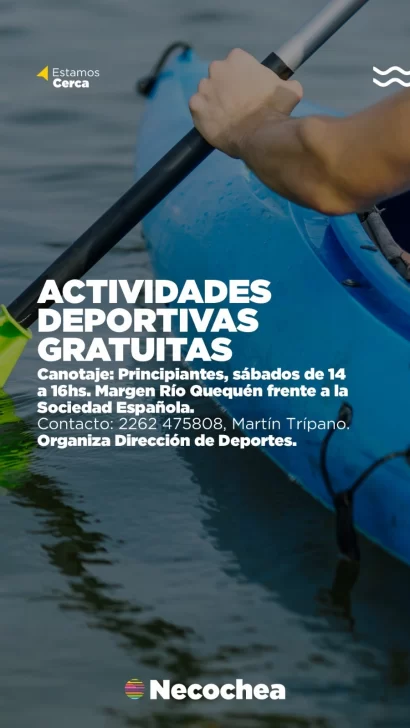- Canotaje: Para principiantes SÁBADOS de 14:00 a 16:00 hs, margen Río Quequén frente a la Sociedad Española – Profesor: Martín Trípano, contacto: 2262 475808 (coordinar previamente).