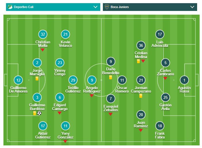 Boca Juniors: Agustín Rossi; Luis Advíncula, Carlos Zambrano, Gastón Ávila, Frank Fabra; Cristian Medina, Jorman Campuzano, Juan Ramírez; Óscar Romero; Exequiel Zeballos y Darío Benedetto. DT: Sebastián Battaglia.