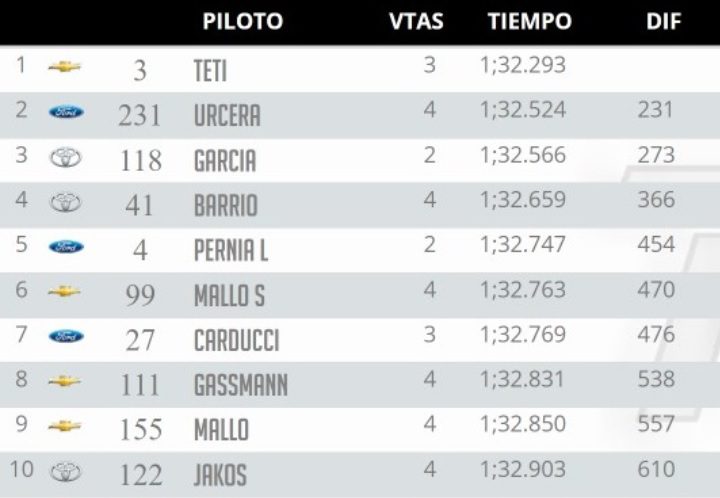 La cuarta posición quedó en manos de Jorge Barrio y la quinta posición la cerró Leonel Pernía.