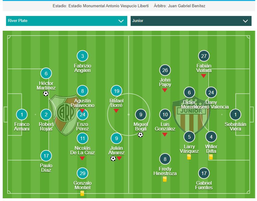 River: Franco Armani; Gonzalo Montiel, Paulo Díaz, Robert Rojas, David Martínez, Fabrizio Angileri; Agustín Palavecino, Enzo Pérez, Nicolás De La Cruz; Julián Álvarez y Rafael Borré. DT: Marcelo Gallardo.