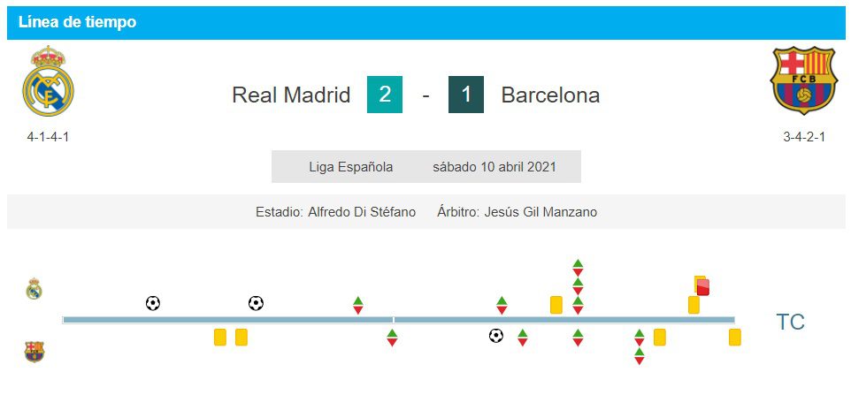 La primera parte del cotejo tuvo un claro dominador: el dueño de casa impuso condiciones, generó las mejores ocasiones y se fue en ventaja al vestuario. La apertura del marcador fue al minuto 13 por una genialidad de Karim Benzema, quien taqueó un buscapié de Lucas Vázquez en el primer palo tras una buena bola profunda por derecha de Federico Valverde. Los dirigidos por Zinedine Zidane gozaron de más claridad y, además, de la diosa fortuna. Un tiro libre ejecutado en el borde del área grande por Toni Kroos se desvió en Sergiño Dest y descolocó a Jordi Alba, que no pudo sacarla en la línea de gol.