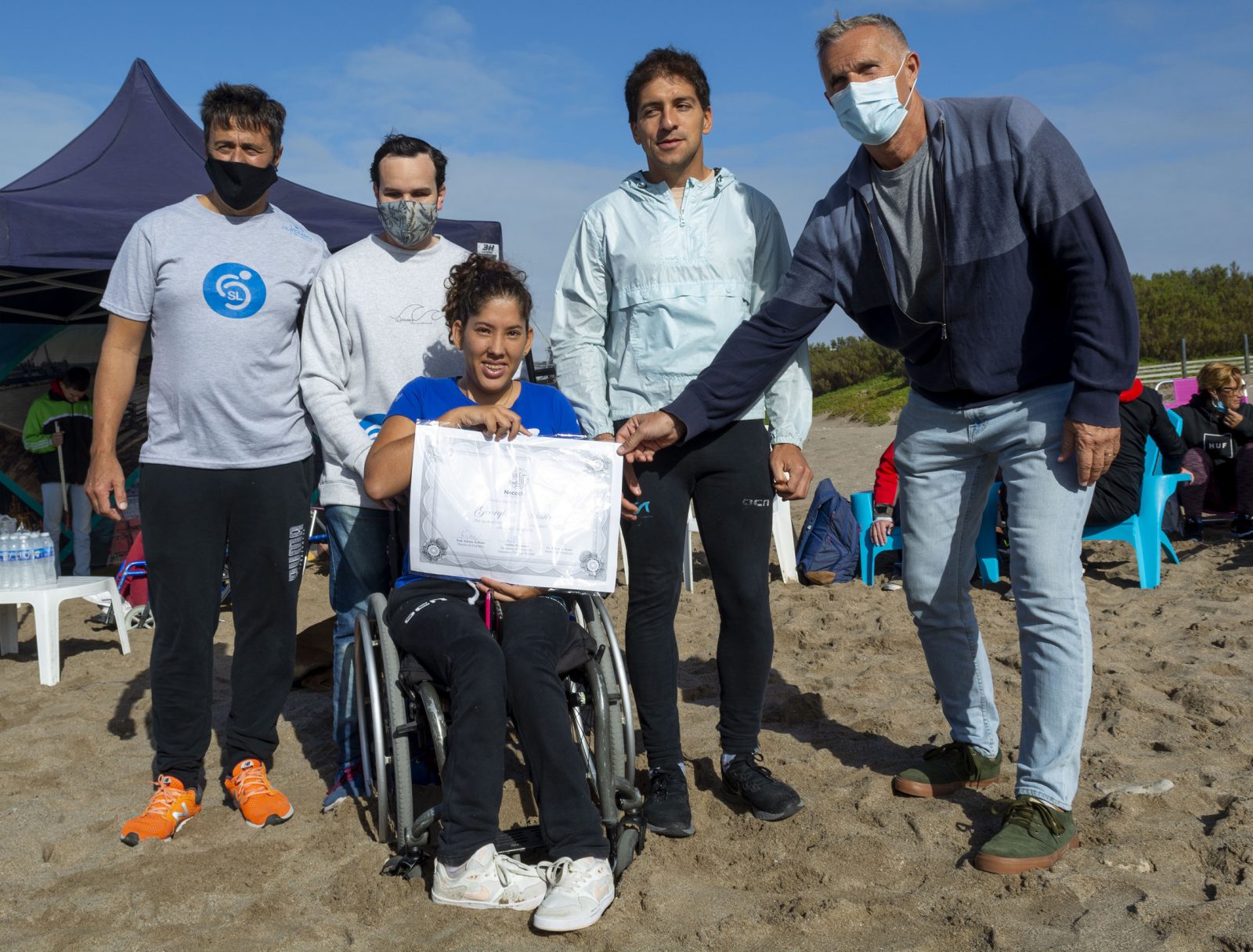 Integrantes de la Escuela de natación adaptado municipal “Todos al Agua” que tiene como responsable al profesor Marcos Bertone tampoco se perdieron la oportunidad de asistir y probar el agua del Atlántico. En un medio que los tiene acostumbrados, aunque sin tablas de por medio, la novedad y el desafío para ellos fue animarse y así lo hicieron pasando un buen momento con uno de sus iconos estrella, el nadador adaptado Nicolás Amendola.