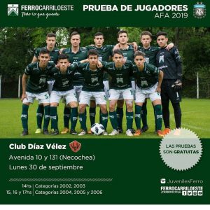 En las instalaciones del club Villa Díaz Vélez de Avenida 10 y calle 131 de nuestra ciudad, este lunes 30 de septiembre el club Ferro Carril Oeste de Buenos Aires realizará una prueba abierta y gratuita para las categorías 2002, 2003, 2004, 2005 y 2006.