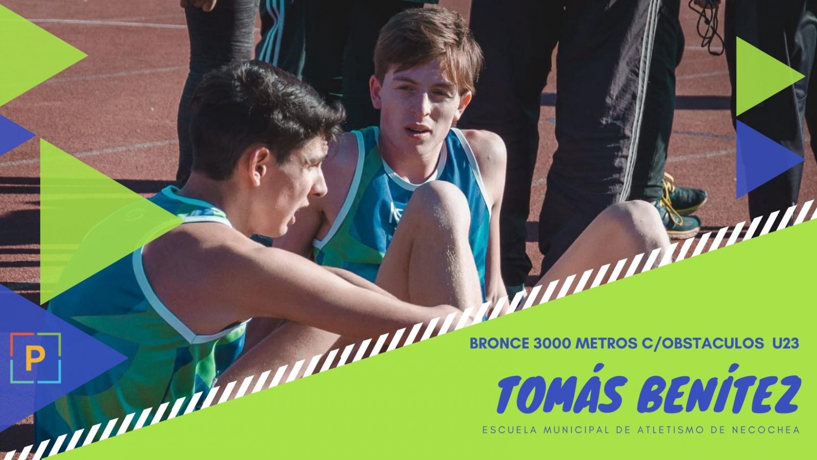 La última presea le perteneció al destacado Tomás Benítez quien se trajo para Necochea la medalla de bronce con su tercer lugar en los 3000 metros con obstáculos realizando un tiempo de 10.13.08, siendo esta su mejor marca, a tan solo una centésima del segundo Lautaro Barragán con 10.13.07 quienes batallaron por la plateada quedándosela finalmente el de Trenque Lauquen. Quien ganó con autoridad fue de Chivilcoy Tomás Vega llegando en 9,44,43.