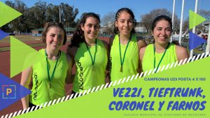 El punto más alto en el podio fue para la posta femenina de los 4 x 400 U23 donde Verina Vezzi, Martina Tieftrunk, Florencia Farnos y Guillermina Coronel sacaron lustre una vez más a la presencia necochense, que tiene a esta prueba siempre como protagonista y así la ciudad se colgó la dorada llegando el team en 4,33, 47 por delante del cuarteto de Mar del Plata (4,39,59) y el de Tres Arroyos (4,41,95).
