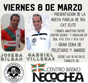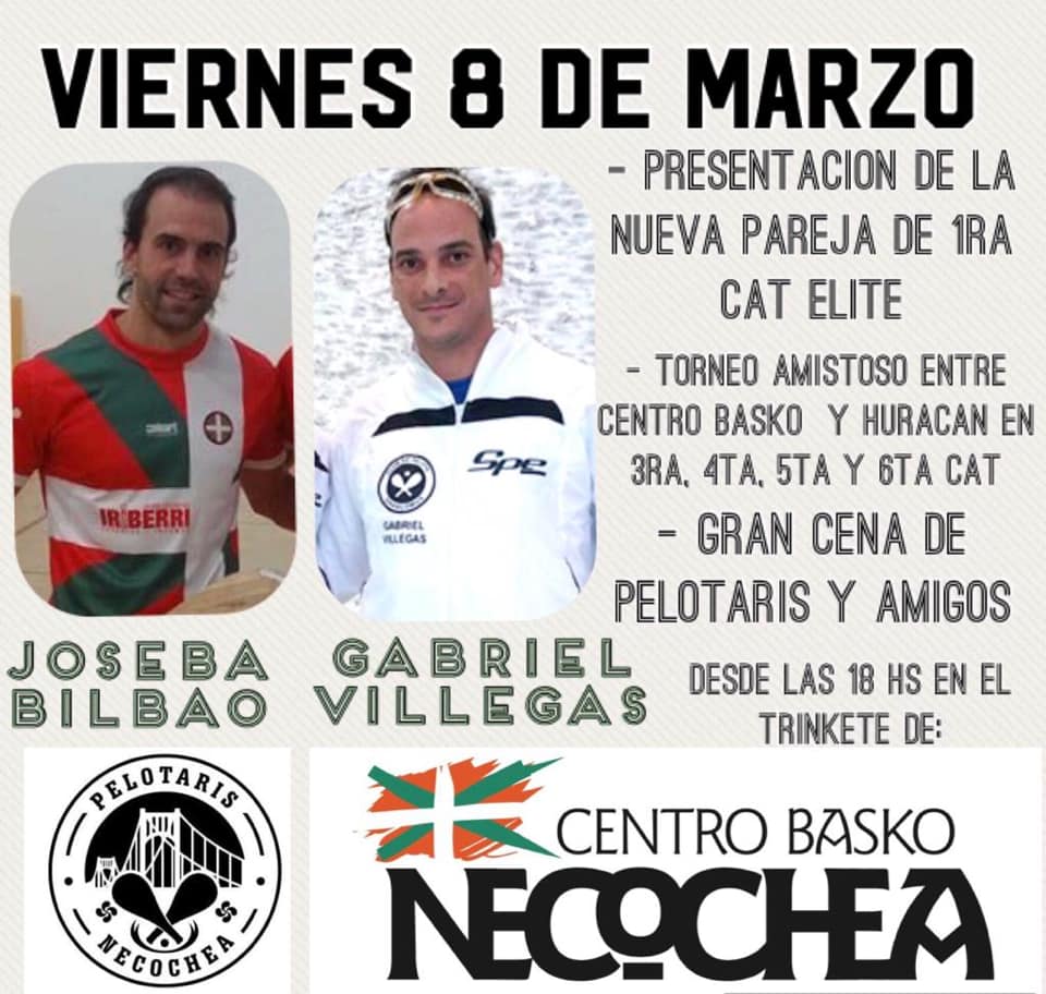 Con la presentación de la nueva pareja pelotari de Primera Categoría Elite que tendrá Centro Vasco con la dupla conformada por el pelotari insignia de Necochea, el mundialista Joseba Bilbao quien se une con el multicampeón Gabriel Villegas se disputará un torneo amistoso entre Centro Vasco y el Club Huracán para las categorías 4ta, 5ta y 6ta a partir de las 18 horas este viernes en el trinquete de la Avenida 58 y calle 65 desde las 18 horas.