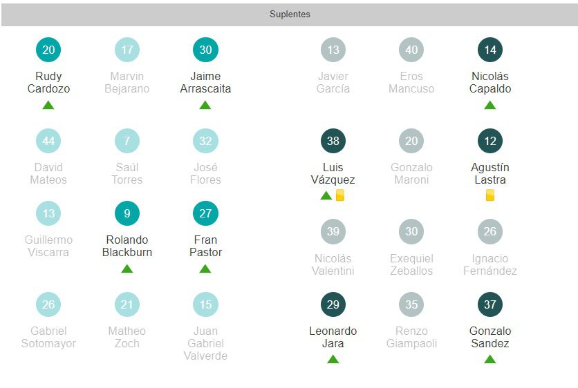 The Strongest: Daniel Vaca; José Sagredo, Gonzalo Castillo y Fernando Marteli; Jesús Sagredo, Diego Wayar, Raúl Castro, Ramiro Vaca y Jeyson Chura; Willie y Jair Reinoso.