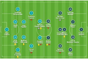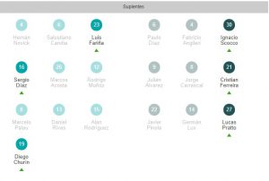 River: Franco Armani; Gonzalo Montiel, Lucas Martínez Quarta, Robert Rojas, Milton Casco; Ignacio Fernández, Bruno Zuculini, Exequiel Palacios, Nicolás De La Cruz; Matías Suárez y Rafael Borré. DT: Marcelo Gallardo.