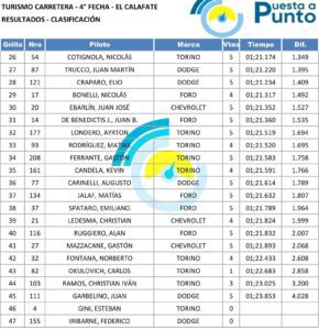 Marcos Quijada (Dodge) fue una de las sorpresas en la clasificación santacruceña. En su 2ª carrera dentro del Uranga Racing, uno de los debutantes del TC quedó 2º luego de la sanción a Julián Santero y se aseguró la posición de privilegio en esta tanda. Va a largar junto a Jonatan Castellano (Dodge) que clasificó 5º. En el segundo escalón estarán Leonel Pernía, que con el 8º puesto completó su mejor resultado desde que corre con Ford, y Matías Rossi (Toyota Camry) que se posicionó en el 11º lugar.