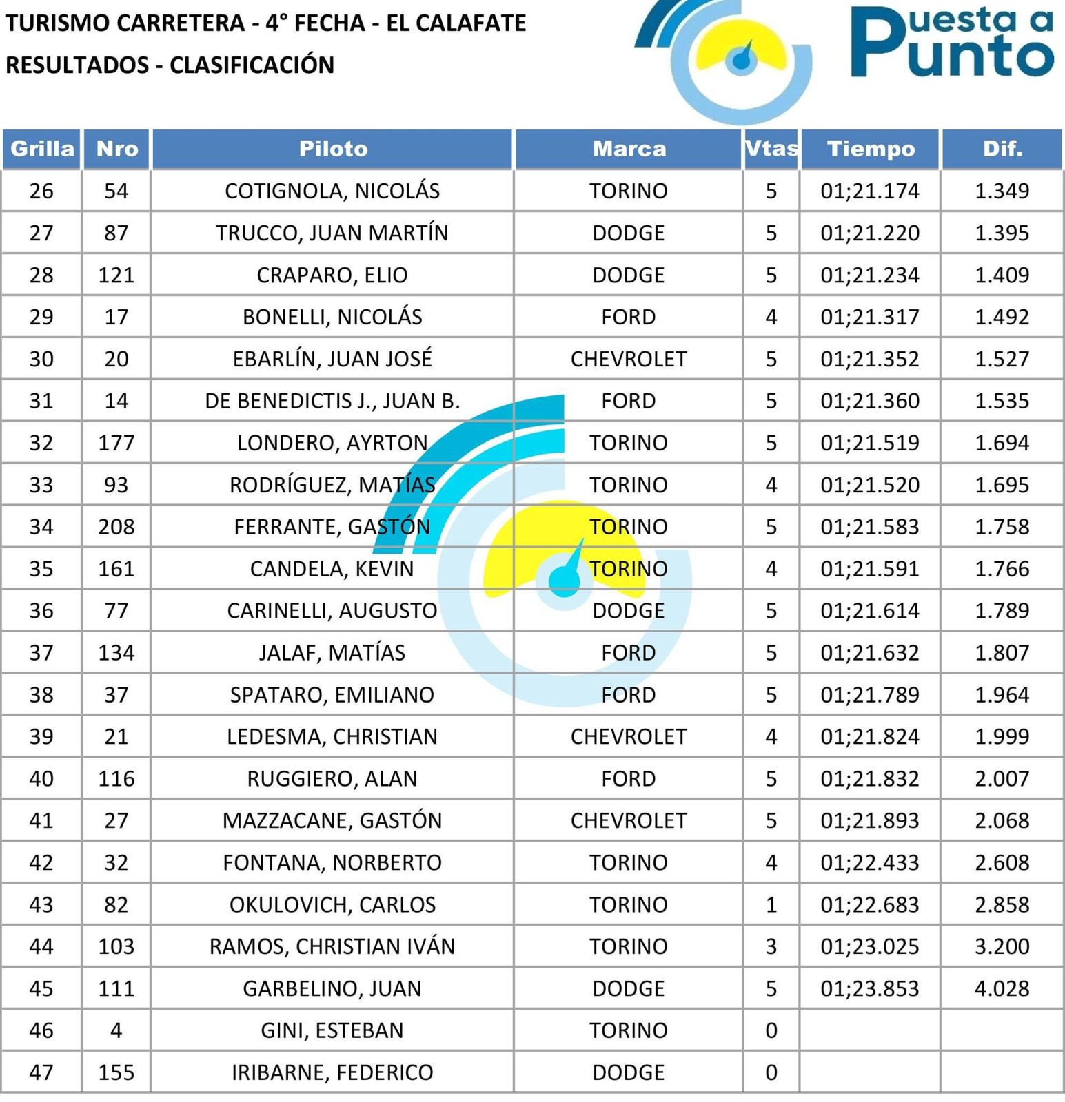 El Turismo Carretera cerró la 4ª clasificación del campeonato en el nuevo autódromo de El Calafate. Otto Fritzler (Ford), Julián Santero (Ford) y Marcos Quijada (Dodge) van a partir adelante en cada una de las 3 baterías que definirán las posiciones de largada de la Final. Las baterías se disputarán este domingo desde las 9:35.
