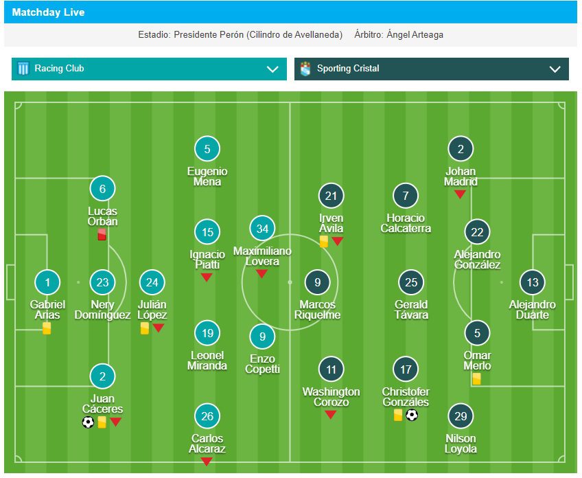 Racing: Gabriel Arias; Juan Cáceres, Nery Domínguez, Lucas Orban, Eugenio Mena; Carlos Alcaraz, Julián López, Leonel Miranda, Ignacio Piatti, Maximiliano Lovera; y Enzo Copetti. DT: Juan Antonio Pizzi.
