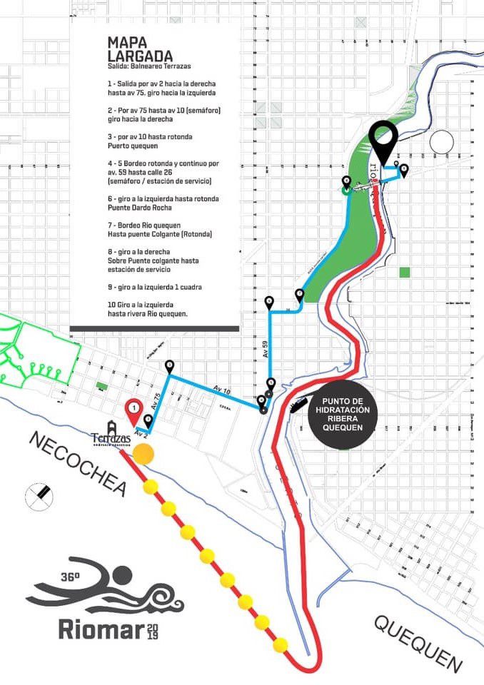 Con el “Chino” Juan Carlos Cuenca a la cabeza desde lo organizativo y su gran equipo de colaboradores, la prueba comienza en el rio Quequén a la altura del puente Colgante “Hipólito Yrigoyen” del margen de la ciudad de Quequén y transita por la calmas aguas del río en línea recta hasta la primera gran curva hacia la derecha entre las calles 38 a 34. Los nadadores deberán sortear 6 curvas más, hallándose a la altura de la calle 12, en la ribera de Quequén, el único punto de hidratación oficial.