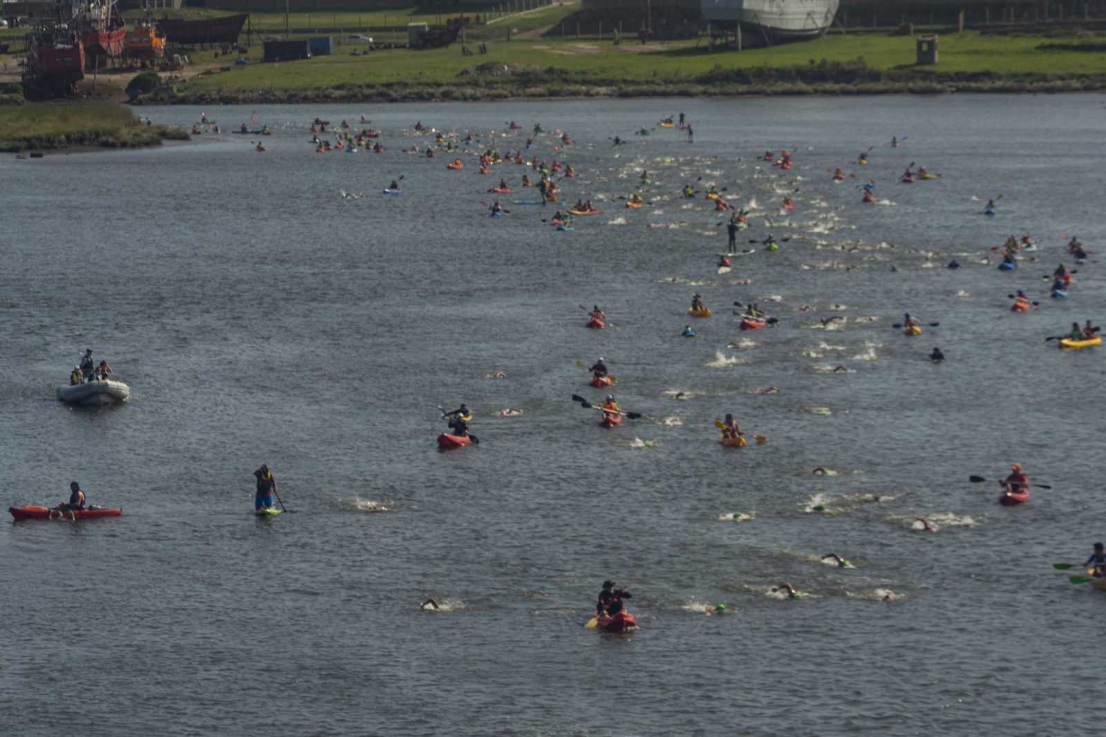 En este tramo de 7k sobre el Quequén y con una temperatura no muy elevada los 550 valientes que se atrevieron a la dura carrera de aguas abiertas fueron buscando un lugar lo más adelante posible en una auténtica marea humana que cubrió gran parte de las aguas del río y el mar.