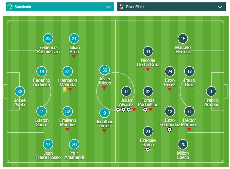 En la siguiente acción una mala salida de Sarmiento y un resbalón del defensor Federico Andueza le permitieron a Julián Álvarez escaparse mano a mano en soledad y definir para estampar el 2 a 0 y cortar con una sequía de 697 minutos. Antes de que termine el primer tiempo, cuando el equipo de Gallardo ya dominaba por completo el juego, Milton Casco apareció en ataque y con espacios lanzó el centro al segundo palo para la llegada de Álvarez, quien en el aire y con su pie derecho selló el tercero.