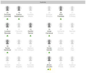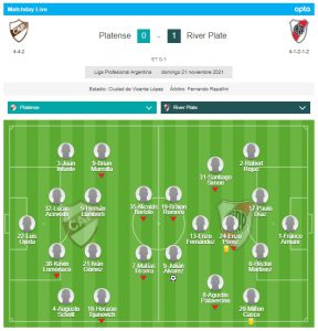River: Franco Armani; Robert Rojas, Paulo Díaz, David Martínez, Milton Casco; Enzo Pérez, Enzo Fernández, Santiago Simón, Agustín Palavecino; Julián Álvarez y Braian Romero. DT: Marcelo Gallardo.