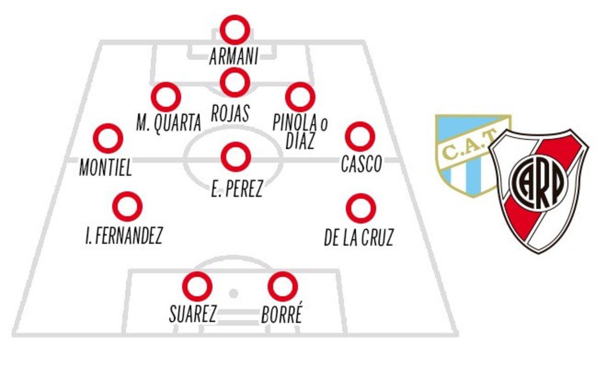 Los 11 de River serían: Armani; Martínez Quarta, Rojas, Pinola o Díaz; Montiel, Pérez, Casco; Nacho Fernández, Nicolás De La Cruz; Suárez y Borré.