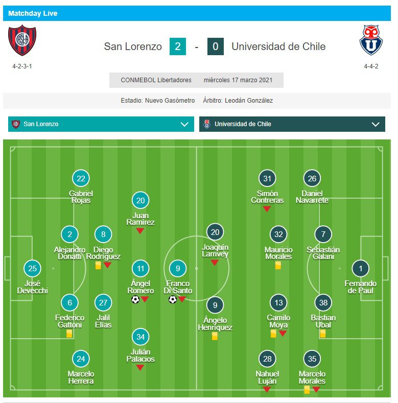San Lorenzo le ganó 2-0 a la Universidad de Chile con goles de Franco Di Santo y Ángel Romero, de gran partido. El encuentro correspondiente a la revancha de la segunda fase de la Copa Libertadores se jugó en el estadio Pedro Bidegain, con el arbitraje del uruguayo Leodán González y televisación de ESPN. Tras el 1-1 logrado en la ida, el Ciclón avanzó a la tercera fase del certamen internacional con un global de 3-1. En dicha instancia se medirá ante el Santos de Ariel Holan. El equipo brasileño es el último finalista de la edición pasada y viene de eliminar a Deportivo Lara con un global de 3-2. El primer encuentro está estipulado para el miércoles 7 de abril en el estadio Pedro Bidegain, y la vuelta será en Brasil, el 14. El vencedor de esta serie se clasificará a la fase de grupos de esta Libertadores 2021.