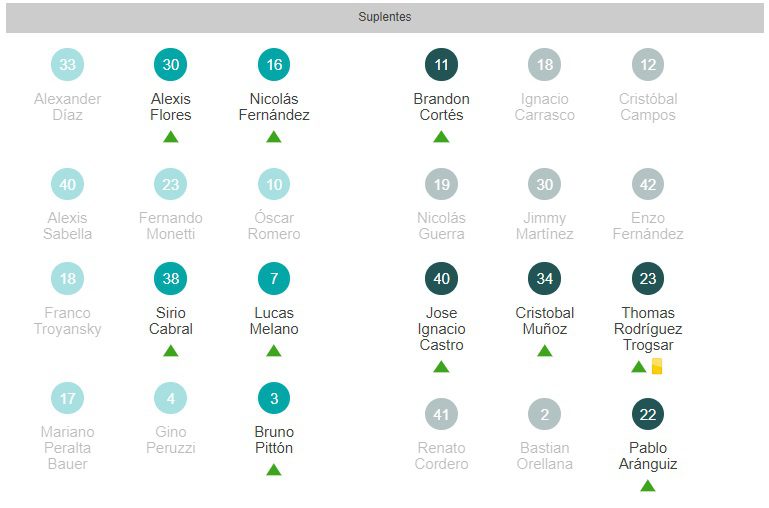 Universidad de Chile: Fernando de Paul; Daniel Navarrete, Camilo Moya, Bastián Ubal y Marcelo Morales; Sebastián Galani; Mauricio Morales, Nahuel Luján, Simón Contreras, Ángelo Henríquez; y Joaquín Larrivey. DT: Rafael Dudamel.