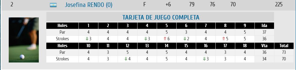 Por su parte, Catalina Rendo quedó ubicada en el 11° lugar sumando un total de 249 golpes con rondas de 84, 78 y 87.