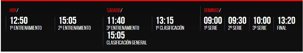 La actividad comenzara este viernes a las 12, 50 hs. con el 1er entrenamiento mientras que el 2do será a las 15, 05. En tanto la acción del sábado 11, 40 tendrá lugar el 3er entrenamiento mientras que la 1era clasificación está prevista para las 13, 15 mientras que la General será a las 15, 05. El plato fuerte; las series 1era, 2da y 3era a las 9; 9, 30 y 10 respectivamente y finalmente la definición con la final a las 13, 20 horas.