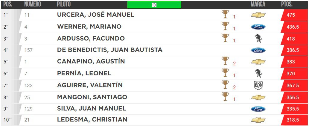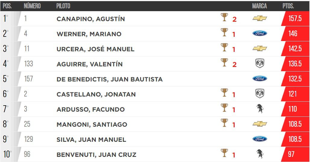 José Manuel Urcera, el rionegrino del JP Carrera, se sitúa en el tercer escalafón de la Copa de Oro, apenas a 15 unidades del líder. Detrás suyo aparece su compañero de estructura: Valentín Aguirre, que posee dos victorias en el corriente campeonato. El joven arrecifeño, que corre a bordo de una Dodge, consiguió el triunfo en la primera edición de esta temporada en Neuquén y es, también, pretendiente a la corona que actualmente posee Canapino.