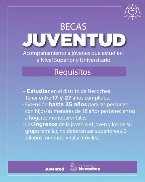 Son requisitos para postularse a este acompañamiento por parte del Estado local cursar una carrera que se dicte en el Partido de Necochea, cumplir con la condición de alumno regular, tener entre 17 y 27 años de edad cumplidos al momento del cierre de la convocatoria y que los ingresos del grupo familiar del o la solicitante no superen los tres (3) Salarios Mínimos, Vitales y Móviles ($608.400, según la última actualización del Ministerio de Capital Humano de la Nación).