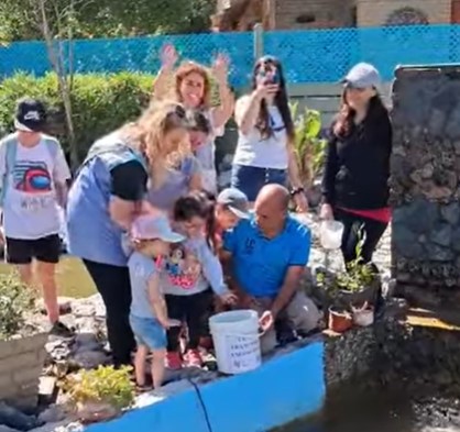 Docentes, familiares y directivos del jardín, llegaron hasta el Lago de los Cisnes con el bagre, llamado Roberto, en un baldecito.