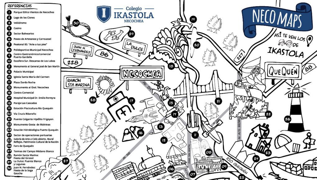 Se trata de un mapa dibujado de Necochea, creado de manera colaborativa por jóvenes de 1º a 6º año del Colegio Ikastola, en el marco de un proyecto de enseñanza denominado Aprendizaje Basado en Proyectos (ABP) con la idea de traspasar el aula virtual y llegar a la comunidad y turistas que eligen nuestras playas.