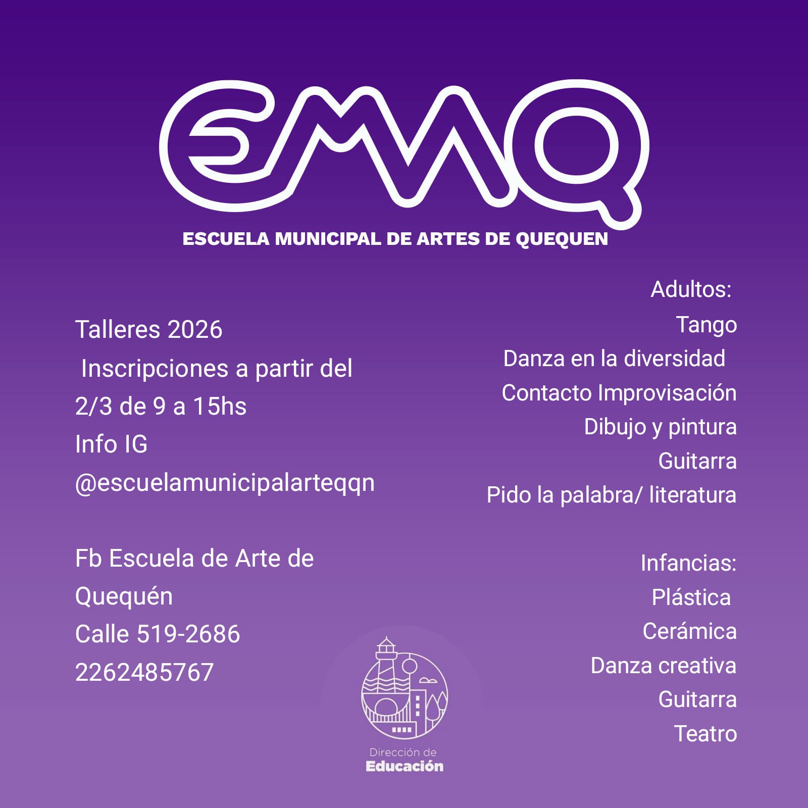 Continúan abiertas las inscripciones para los talleres que se dictarán durante el Ciclo Lectivo 2026 en la Escuela Municipal de Artes de Quequén (EMAQ), ubicada en calle 519 N° 2686.