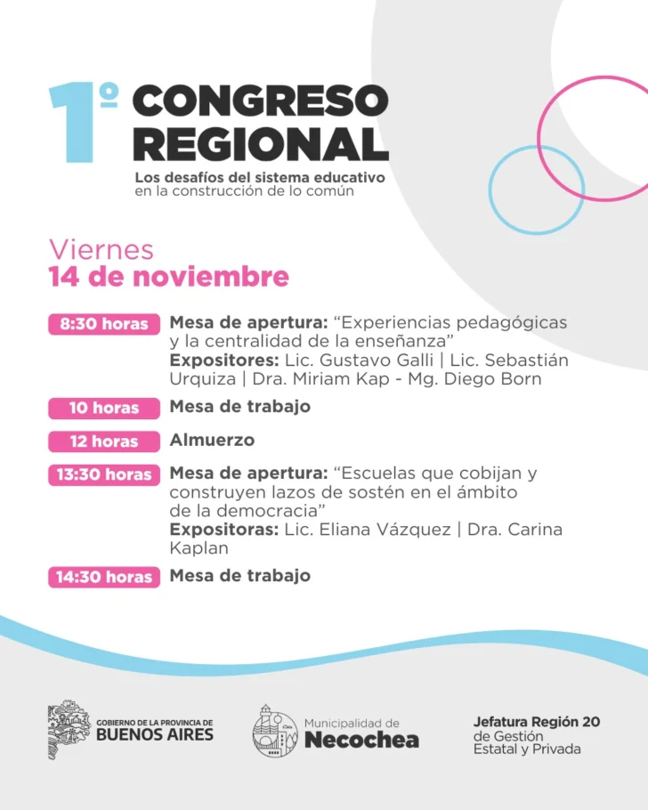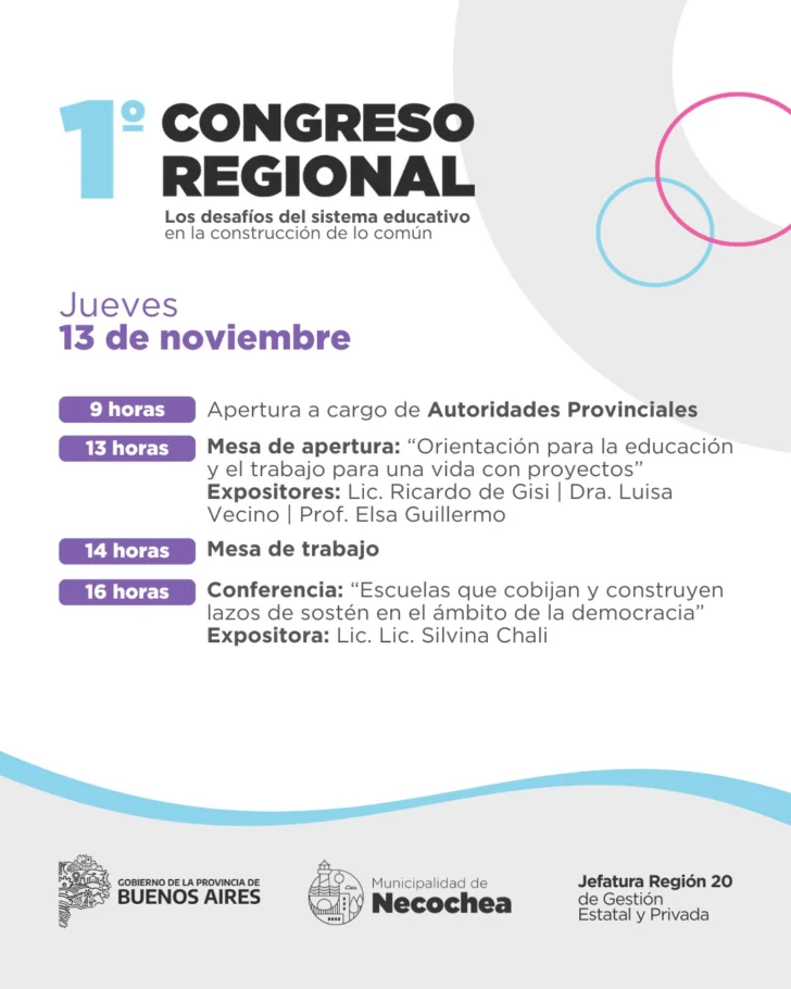 Durante las jornadas de este jueves 13 y viernes 14 de noviembre, desde Necochea se pretende marcar un hito en la agenda educativa de la Región 20, con lo que será el 1º Congreso Regional de educación, a desarrollarse en el Teatro Municipal “Luis Sandrini” y Centro Cultural local, con la presencia de destacados actores educativos de la provincia.