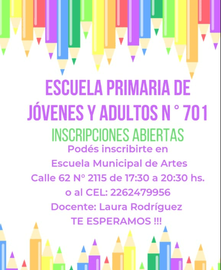 La escuela primera de jóvenes y adultos N° 701 abrió su inscripción para poder culminar los estudios o hacerlos de manera completa según se informó desde el establecimiento a cargo de la docente Laura Rodríguez.