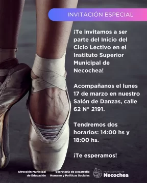 El Instituto Superior Municipal de Necochea (ISMN) vivirá su primer inicio de ciclo lectivo este lunes 17 de marzo, en el predio de la vieja estación de trenes, donde funciona su salón de danzas. Para compartir esta alegría, invitaron a toda la comunidad a ser partícipe del acontecimiento, en alguno de los dos horarios en los que estará dividido el acto: a las 14 y a las 18.