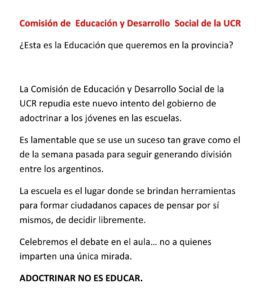 Las principales fuerzas que conforman Juntos por el Cambio en nuestro Distrito, el PRO y la UCR difundieron comunicados en los cuales critican duramente lo que para ellos es una intención de adoctrinamiento por parte del Gobierno Nacional y provincial para con los alumnos de niveles secundario.